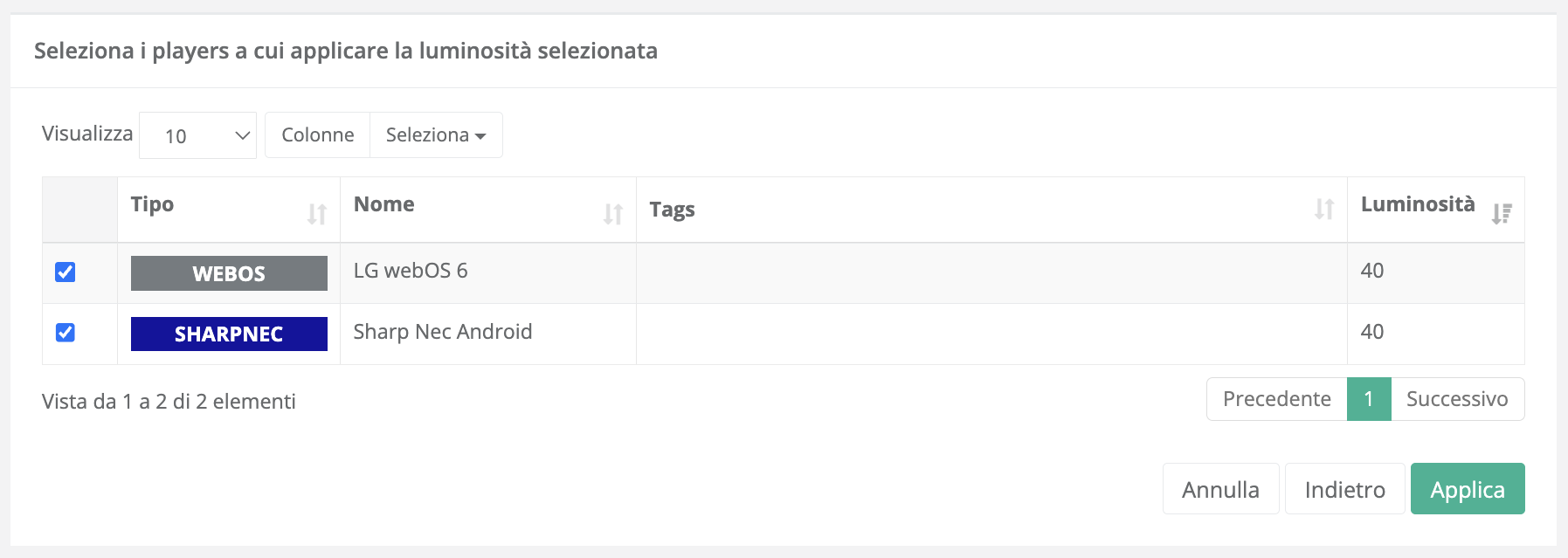 Viene mostrata la tabella “Seleziona i players a cui applicare la luminosità selezionata”.