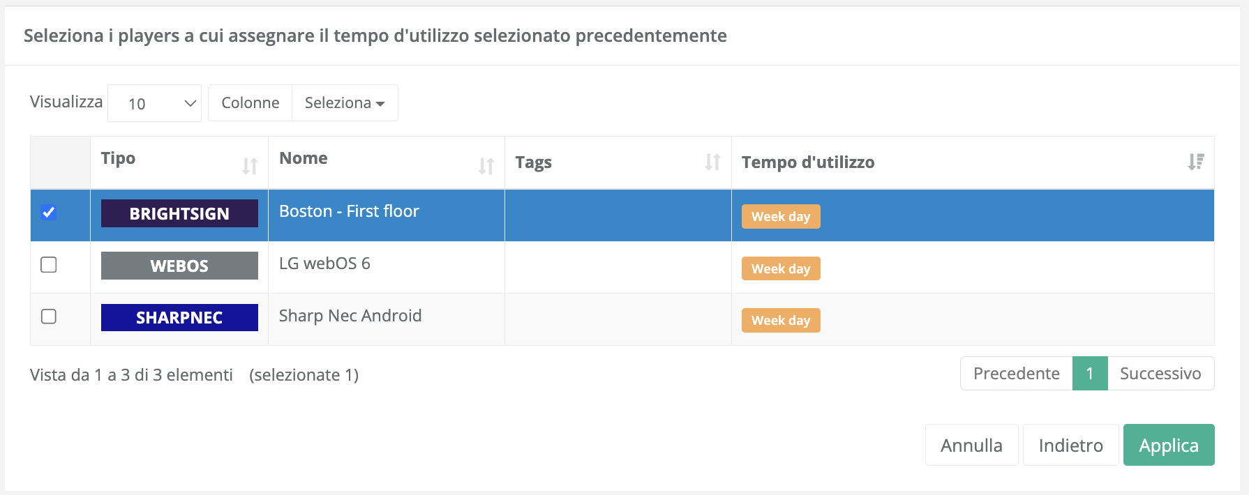 Dalla tabella “Seleziona i players a cui assegnare il tempo d’utilizzo selezionato” con colonne Tipo, Nome, Tags, Tempo d’utilizzo.