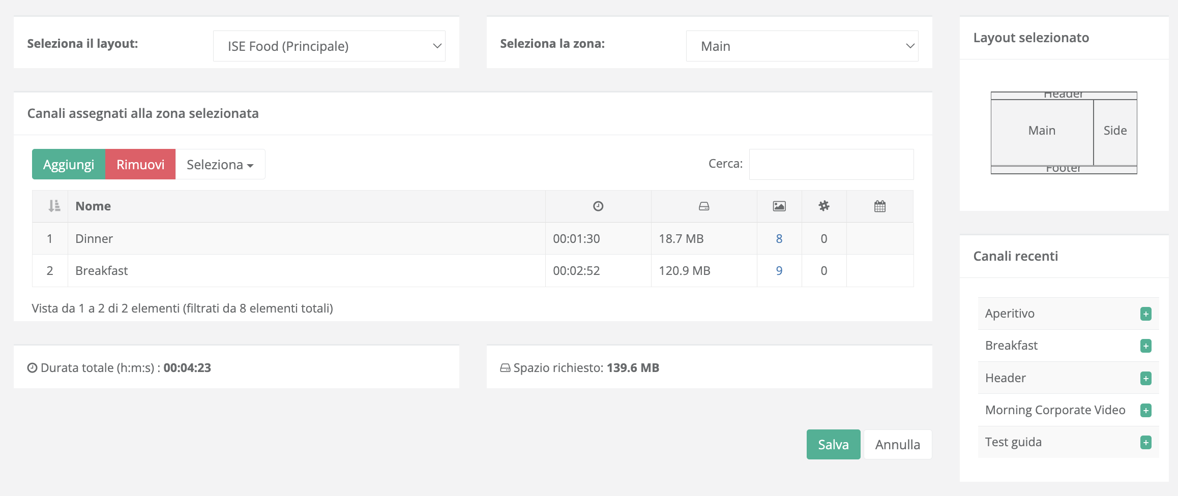 Premendo sul bottone Gestisci nella sezione di visualizzazione dei canali, si accede a una schermata dedicata alla gestione dei canali per ogni zona del layout.