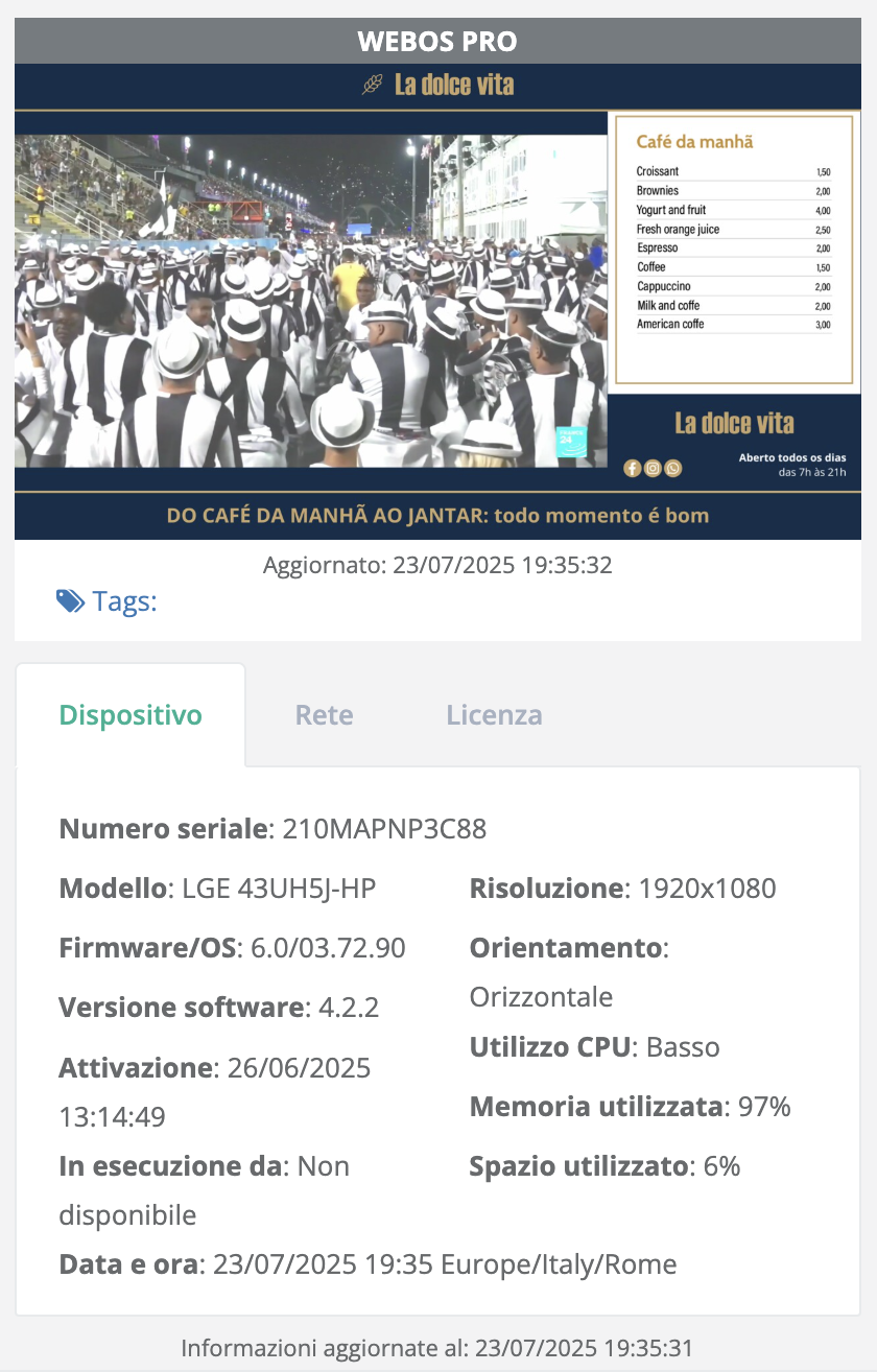 - Dispositivo → dati tecnici come numero seriale, modello, firmware/OS, versione software, risoluzione, utilizzo CPU, memoria, spazio libero.