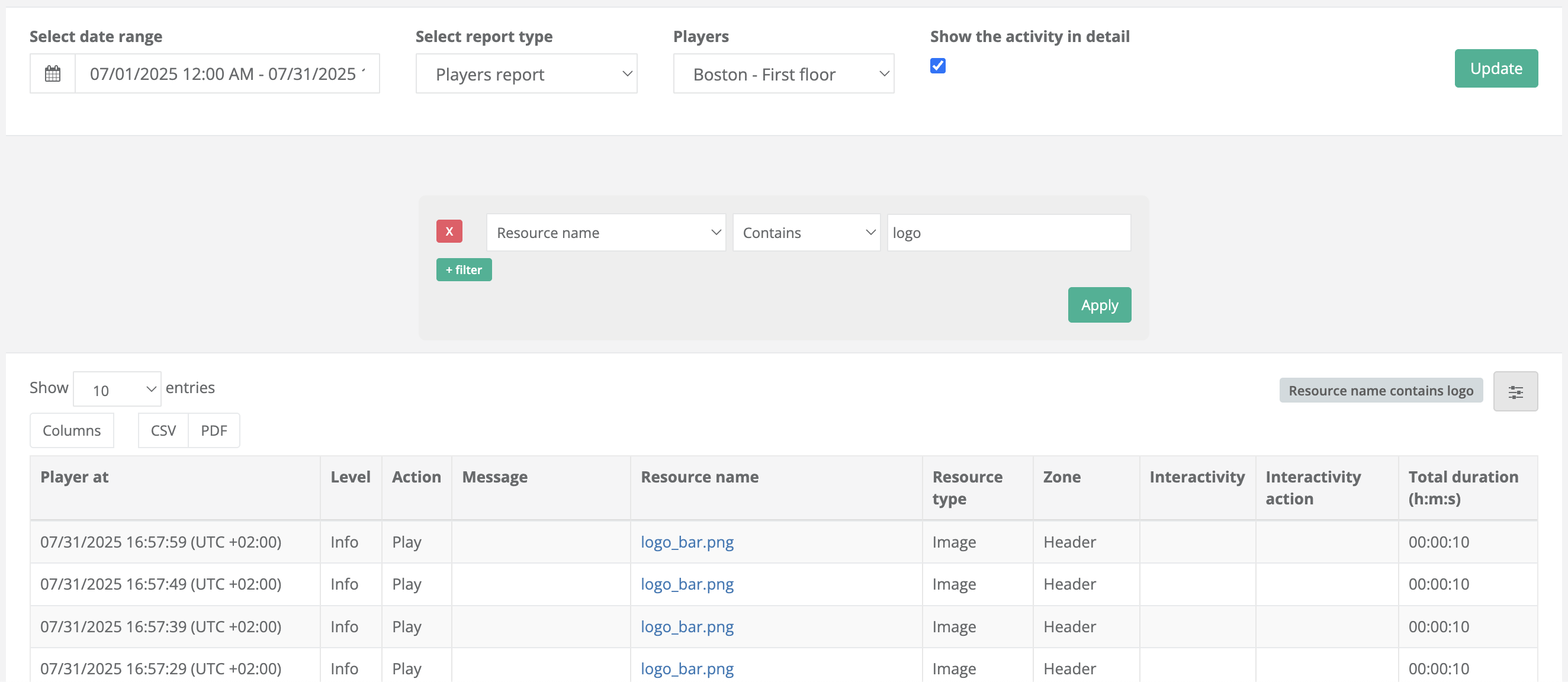 The Activity Report feature of smartiKette gives you a complete overview of what happens within your player network, both from a marketing/commercial perspective (proof of play) and a technical/diagnostic one (operation logs).