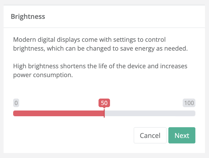 - Set Brightness to values suited to the environment (lower it during low-traffic hours).