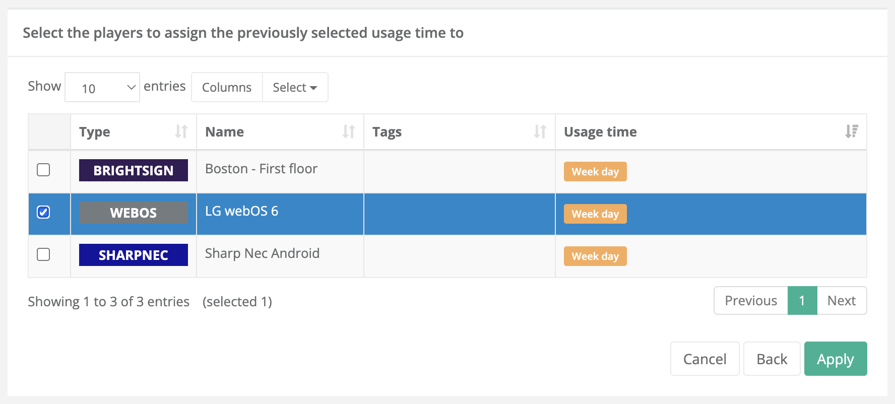 From the table “Select the players to assign the selected usage time” with columns Type, Name, Tags, Usage time: