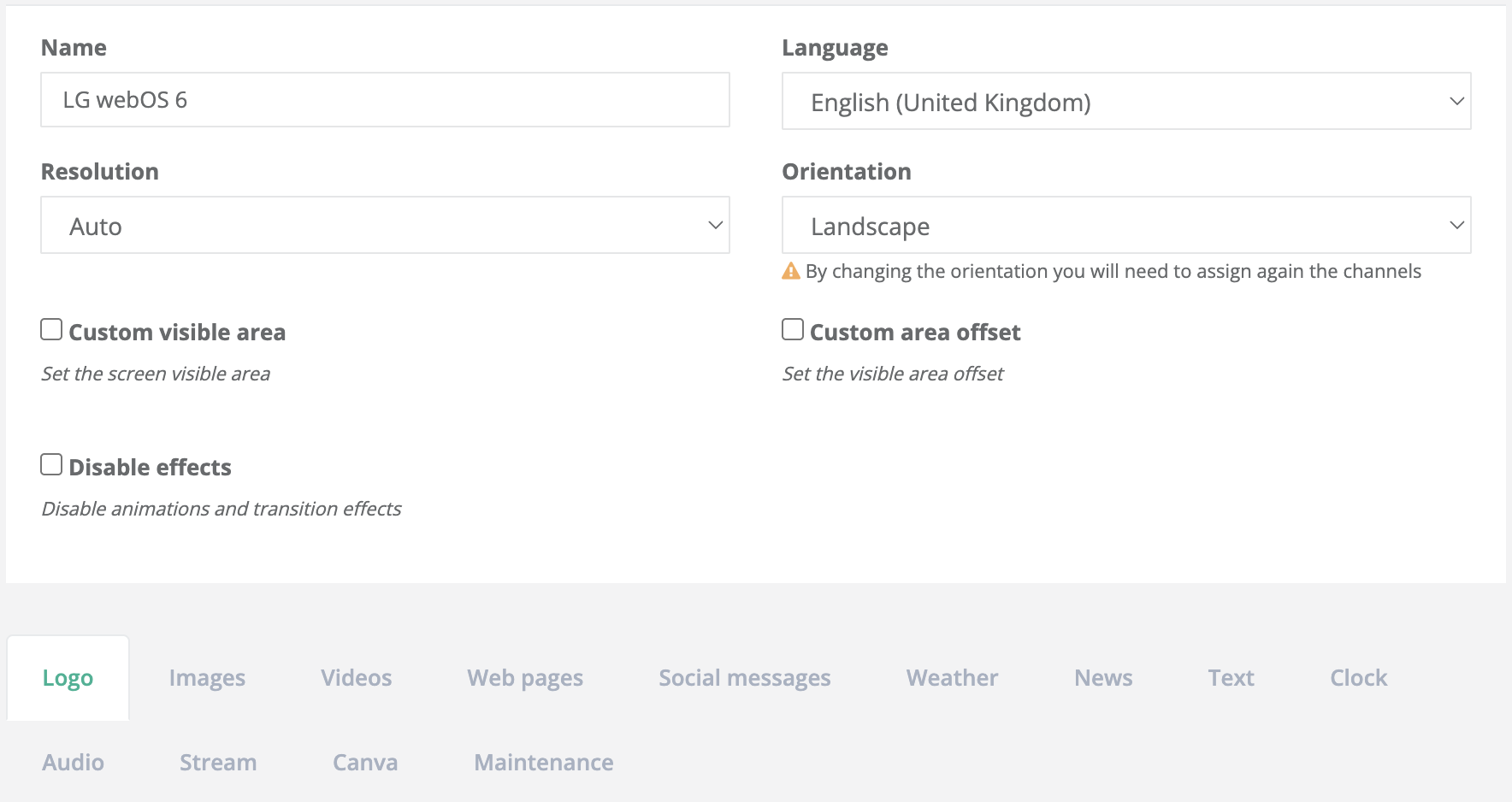 This screen lets you configure the device resolution, orientation, and how the various content types are displayed, along with other options.