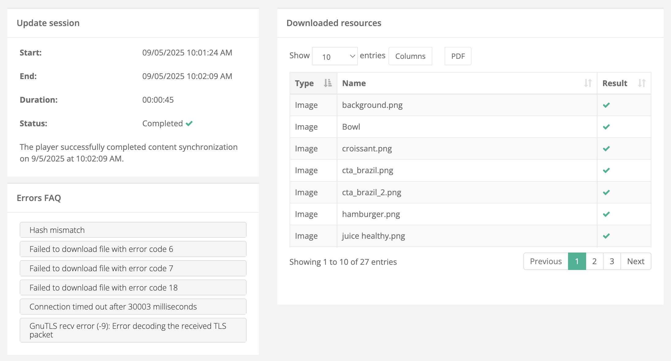 Here you can select a specific update session to verify whether resources were downloaded correctly and analyze possible errors.
