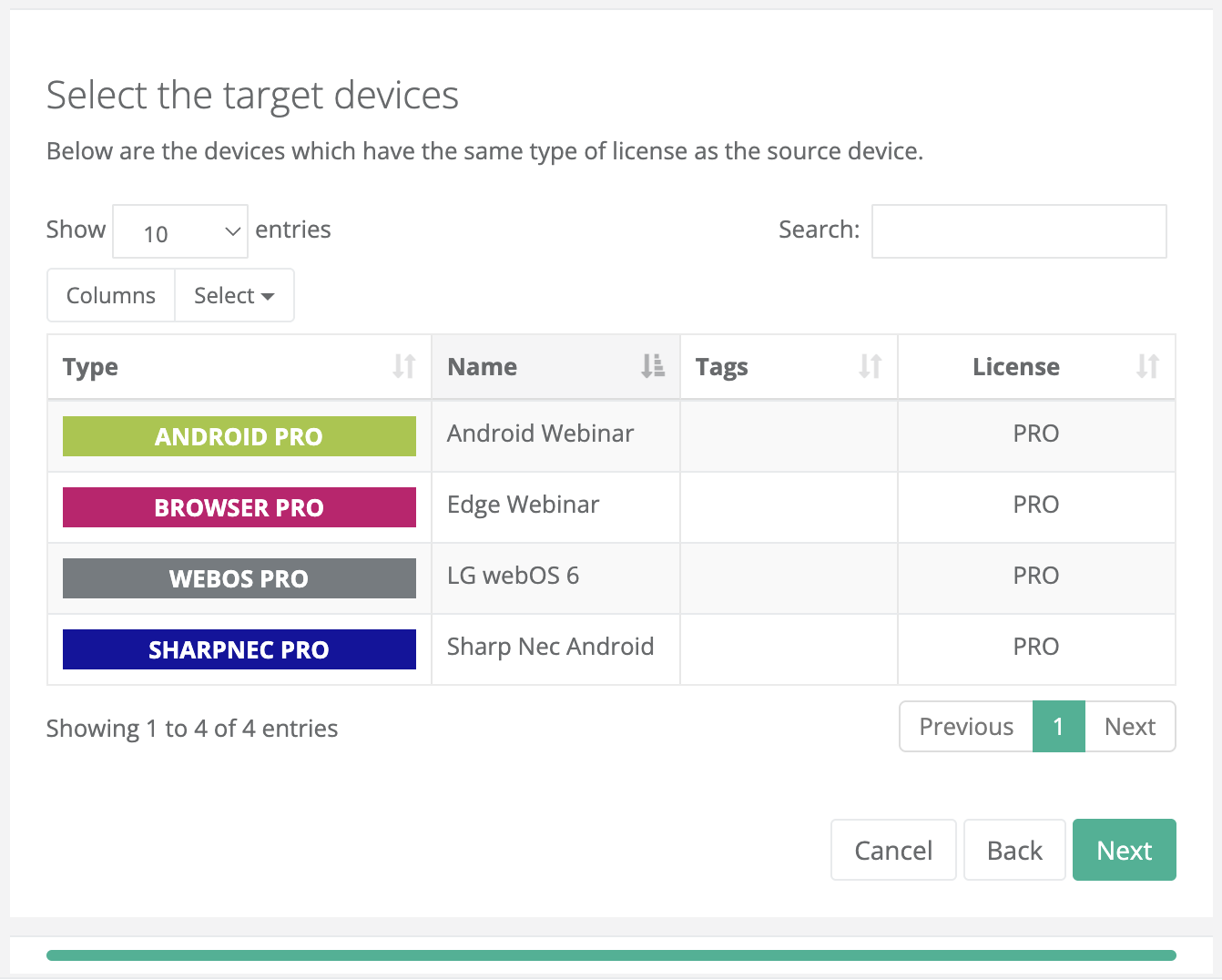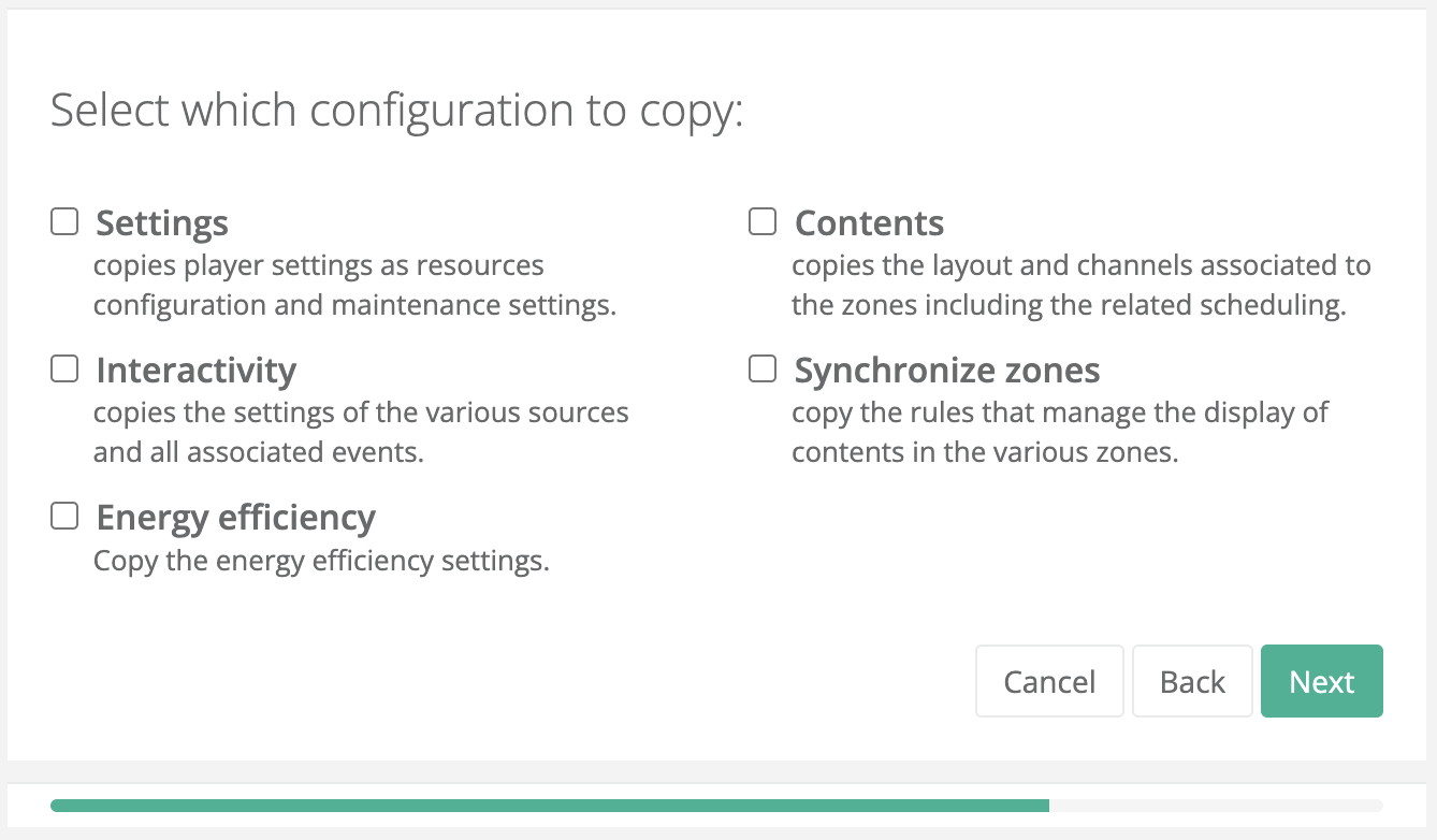 Select which configurations to copy, such as: resolution, orientation, channel and layout settings, logos, images, videos, and display preferences.