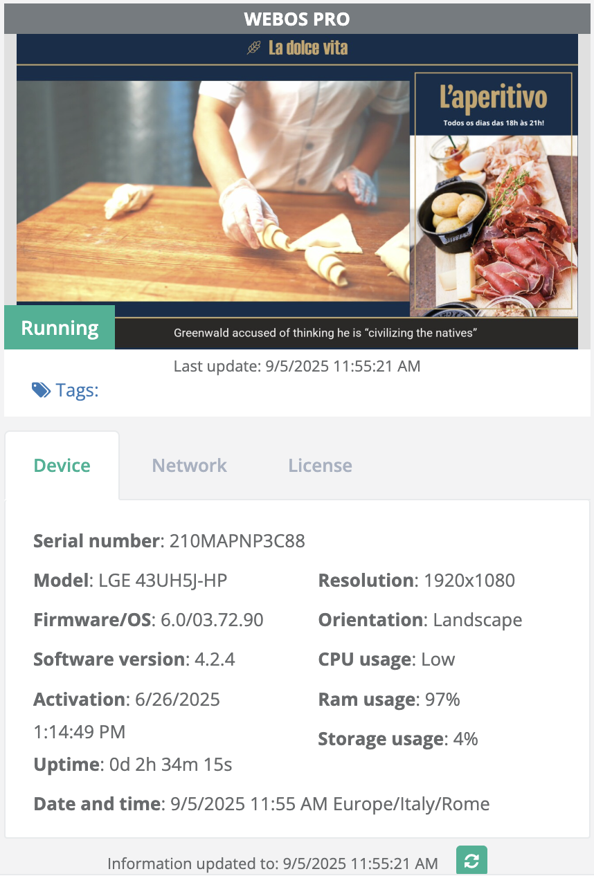 - Device → technical data such as serial number, model, firmware/OS, software version, resolution, CPU usage, memory, free space.